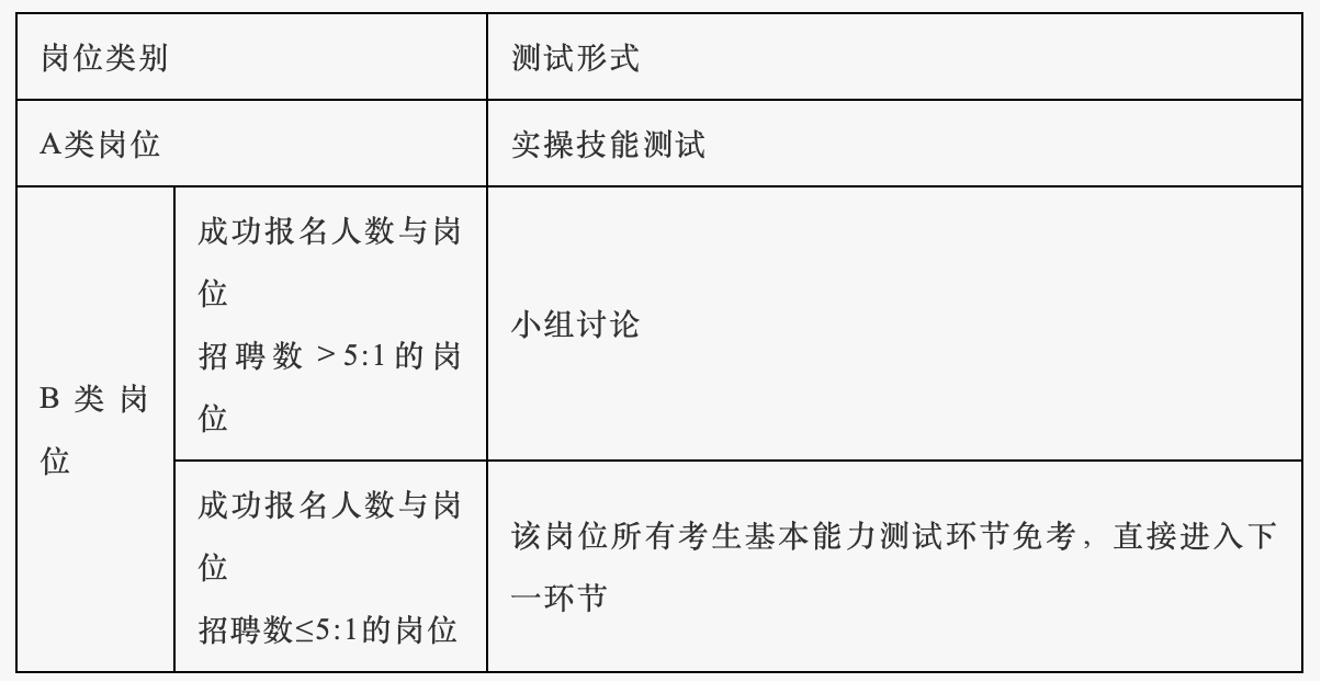 (3)基本能力测试主要采取实操技能测试、小组讨论等形式对考生进行考察。各岗位具体考核形式见下表。