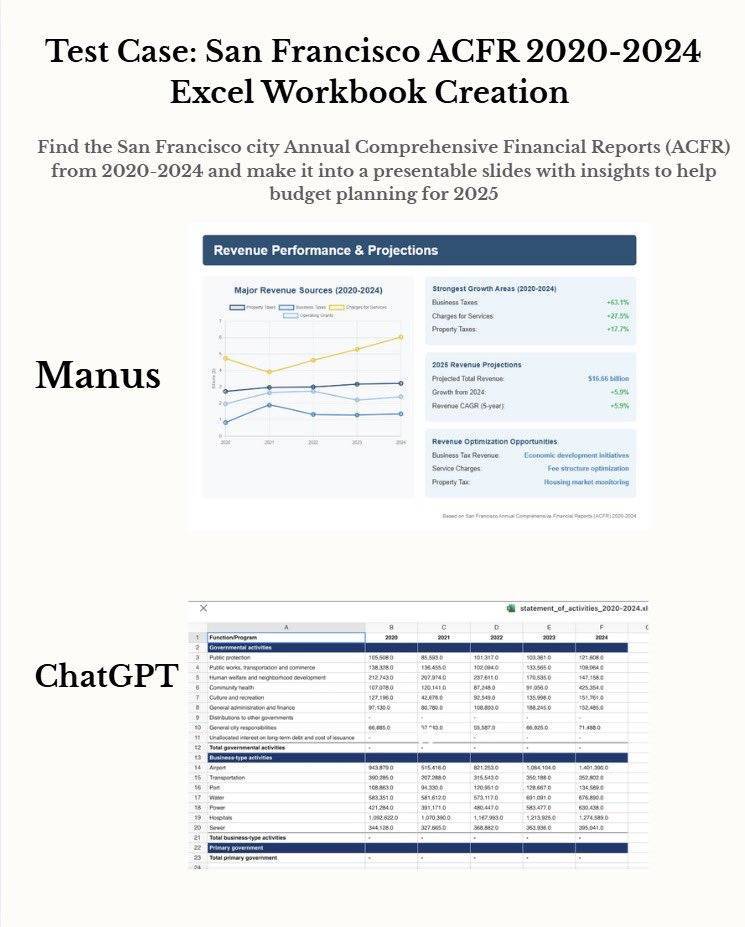 又如分析旧金山市过去四年的财务报告,OpenAI 输出的是 Excel 文件,而 Manus 给出的是包含图表与要点总结的完整演示文档。“Manus 完成的是整个项目,而不仅仅是提供数据。”Manus 评价说。