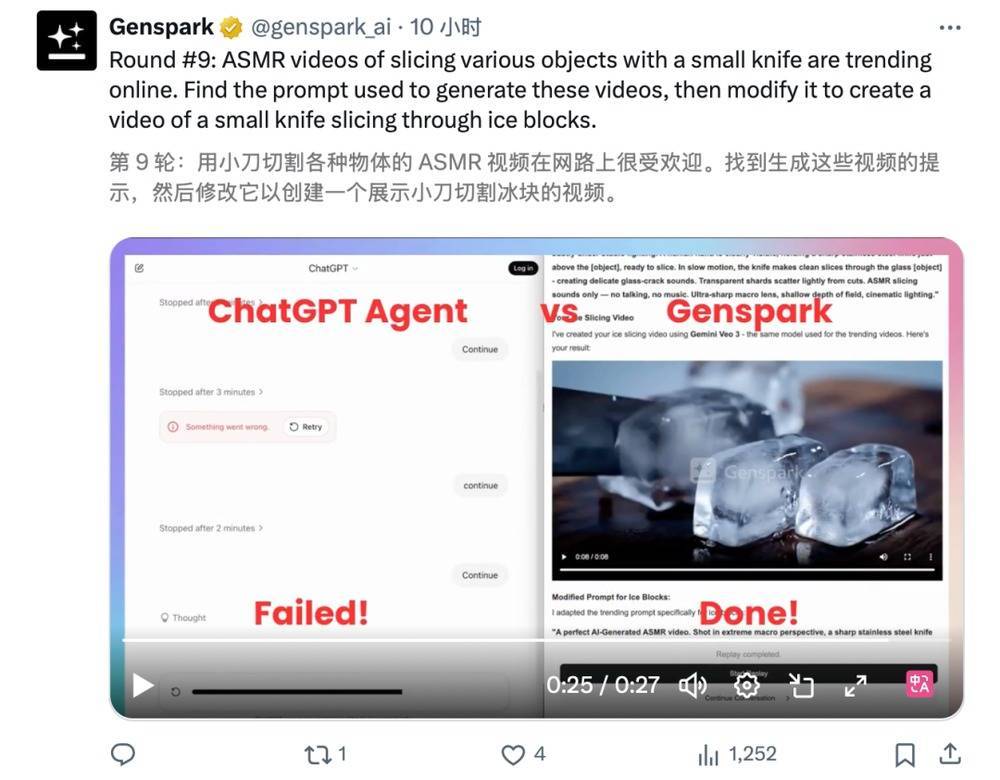 7 月 19 日,Genspark 也在社交平台上分享了 9 个与 ChatGPT Agent 的对比实例,显示他们输出的文档数据维度更丰富,排版更加美观。除了与 Manus 对比测试中类似的旅游行程制定、财务数据分析等案例外,他们还分享了一则视频生成能力的对比,指出 ChatGPT Agent 未能完成任务。