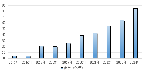 收购可以快速实现公司规模扩张,但值得注意的是,爱尔眼科的商誉也在快速攀升。数据显示,该公司2022年至2024年的商誉分别为54.58亿元、65.33亿元、84.48亿元,三年时间增加30亿元。其中,2024年的商誉大幅超过35.56亿元净利润水平,在其332.55亿元总资产中占比超过25%。