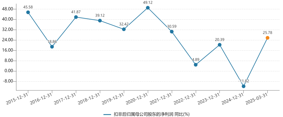 不过2025年一季度,公司业绩同比增速回升。其中,营收实现60.26亿元,同比增长15.97%,归母净利润实现10.50亿元,同比增长16.71%。